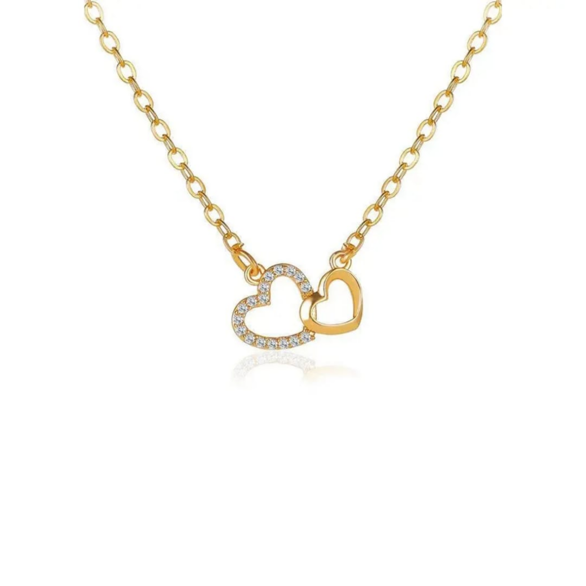 Design: Double-heart pendant — one polished gold, one pavé-studded — linked together for a symbolic, sophisticated finish