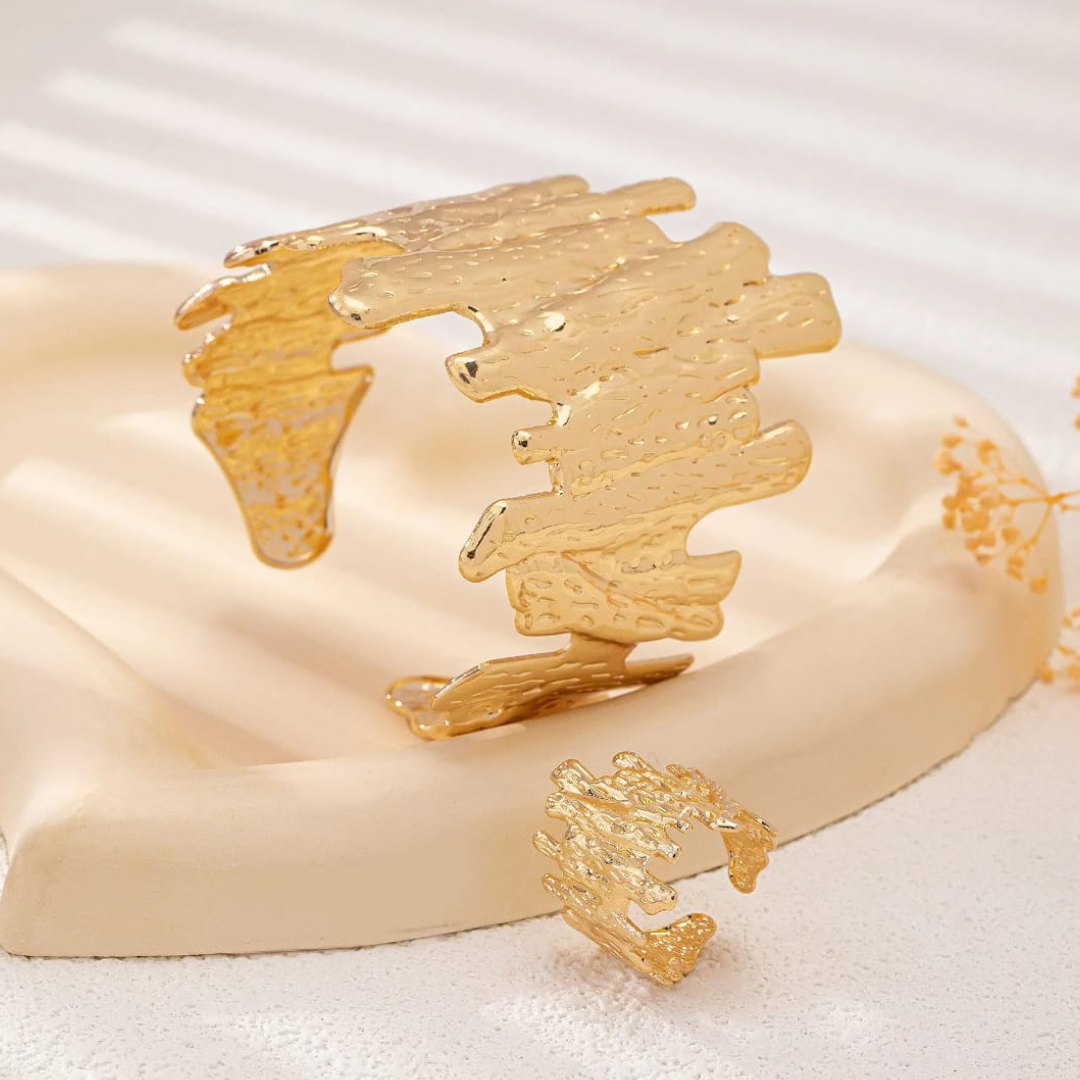 Design: Organic molten-gold texture crafted into a statement cuff and matching ring