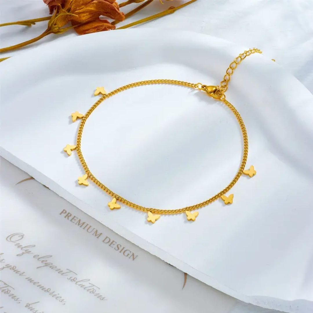 The Fluttering Mini Butterfly Anklet is a delicate and whimsical piece designed to add charm to your everyday look. Featuring a slim chain adorned with a tiny polished butterfly charm, it brings subtle sparkle and effortless elegance to any outfit. Lightweight and versatile, it’s perfect for layering or wearing solo as a minimal, chic accessory.