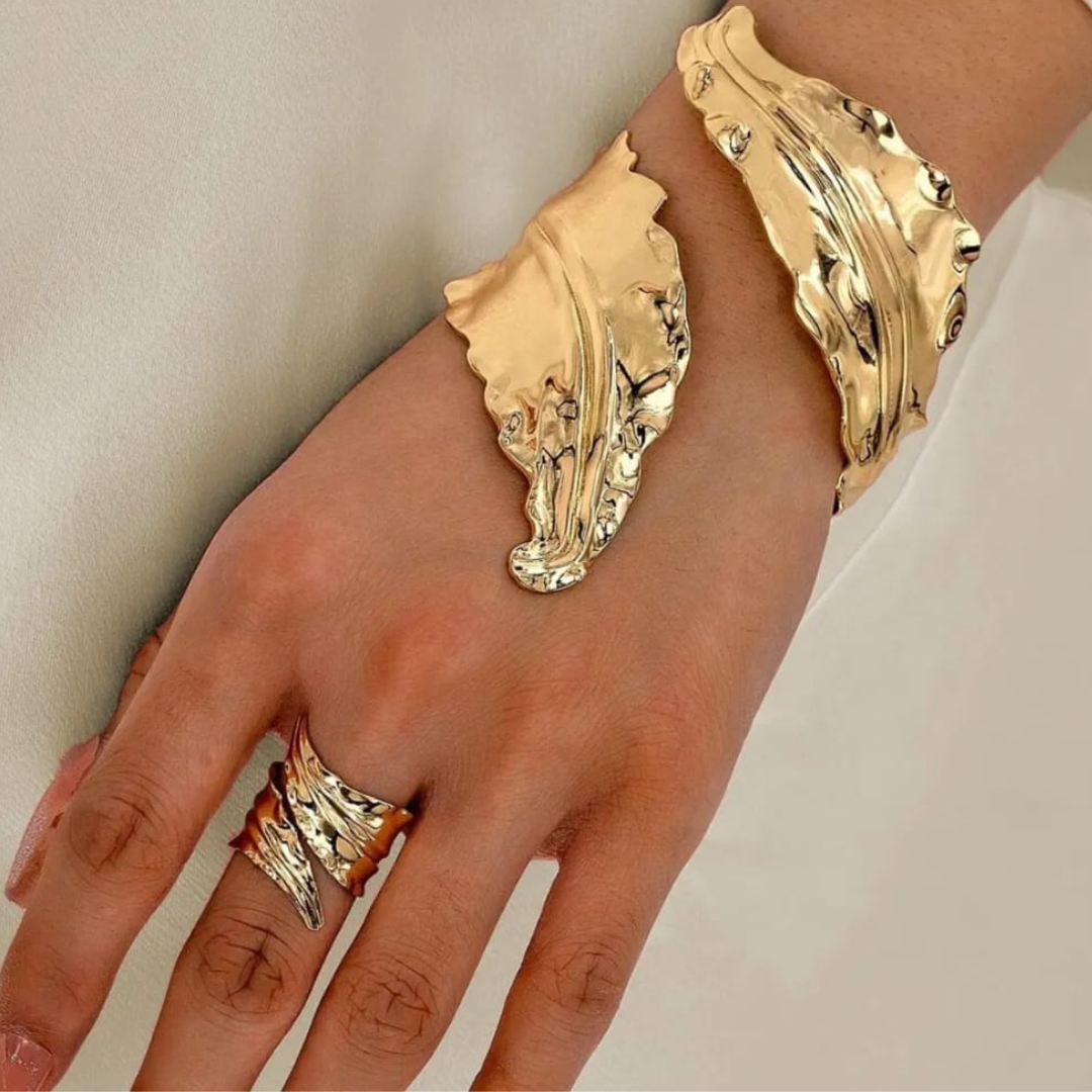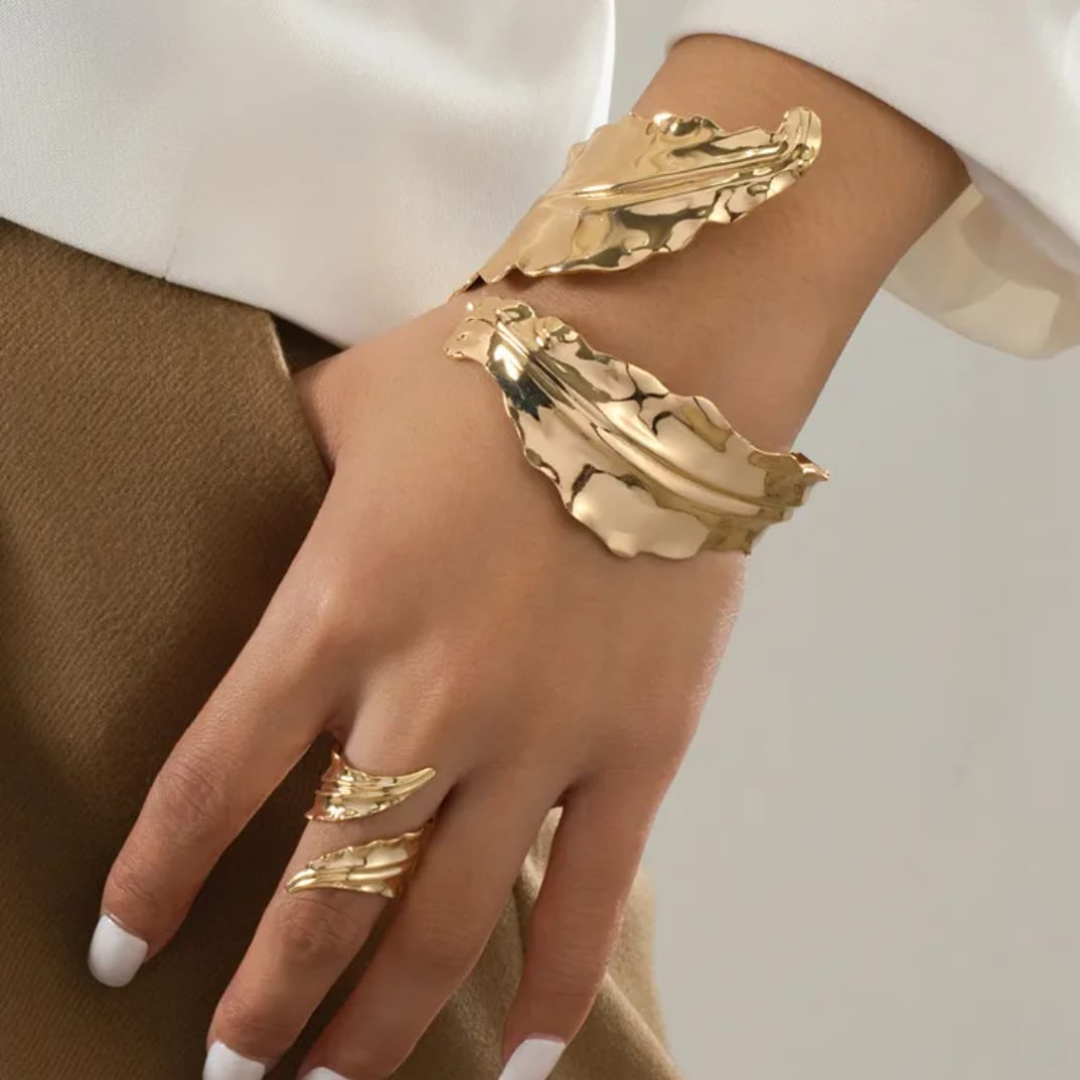 Design: Matching leaf-pattern bracelet and ring with smooth, polished detailing